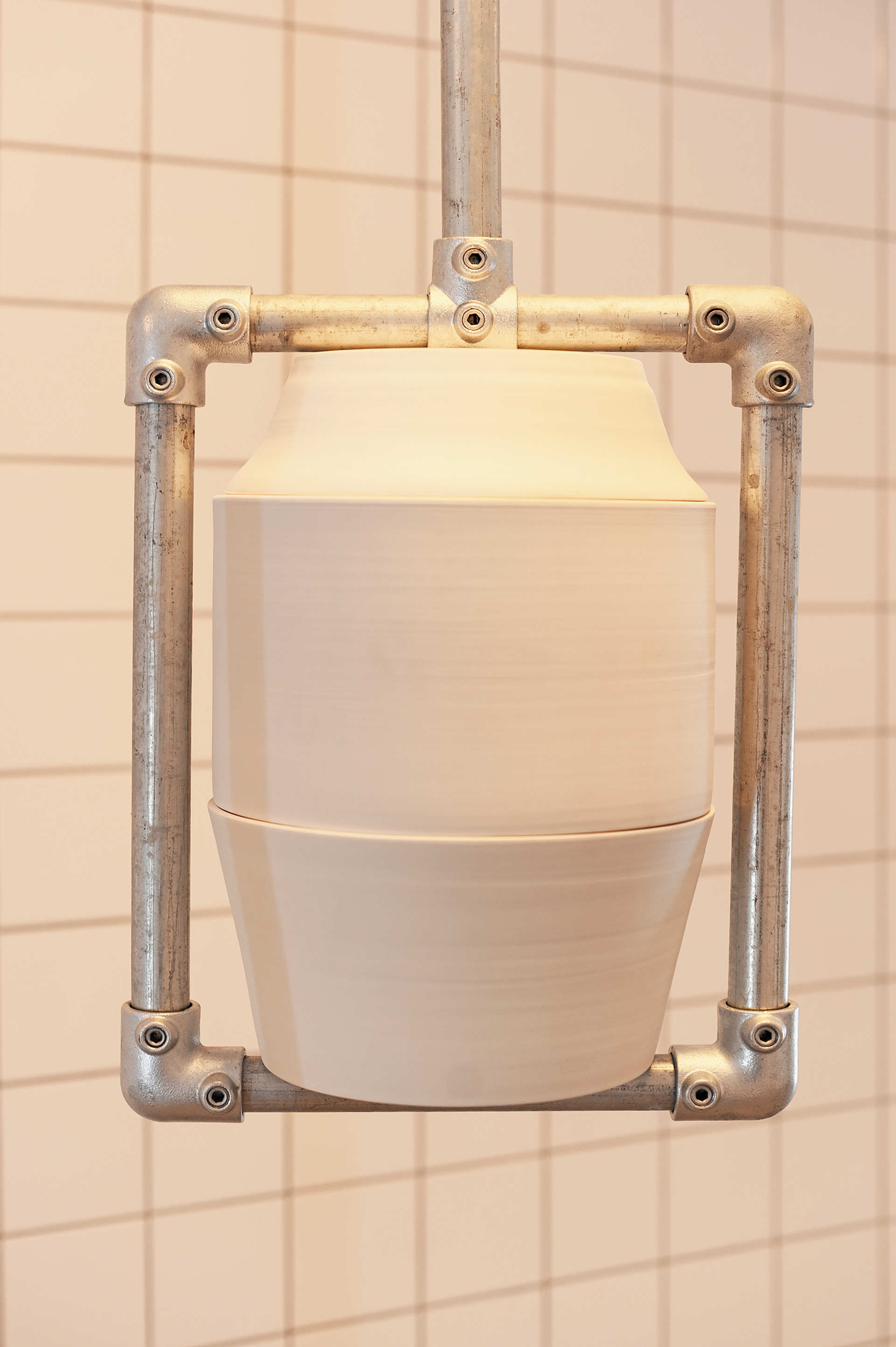 Keramiek en staal zijn twee elementen die geregeld terugkomen in het werk van Hannah Reede. Beide materialen zijn modulaire systemen, met beide is te bouwen. Met de een preciezer dan de ander. Zodra deze materialen gecombineerd worden ontstaat er een spanningsboog waarin de materialen elkaar complementeren. De machine-gemaakte, steigerbuis wordt gecombineerd met de handgemaakte-keramiek. Een feminien en masculine kant. Wie draagt wie en wie wordt gedragen?