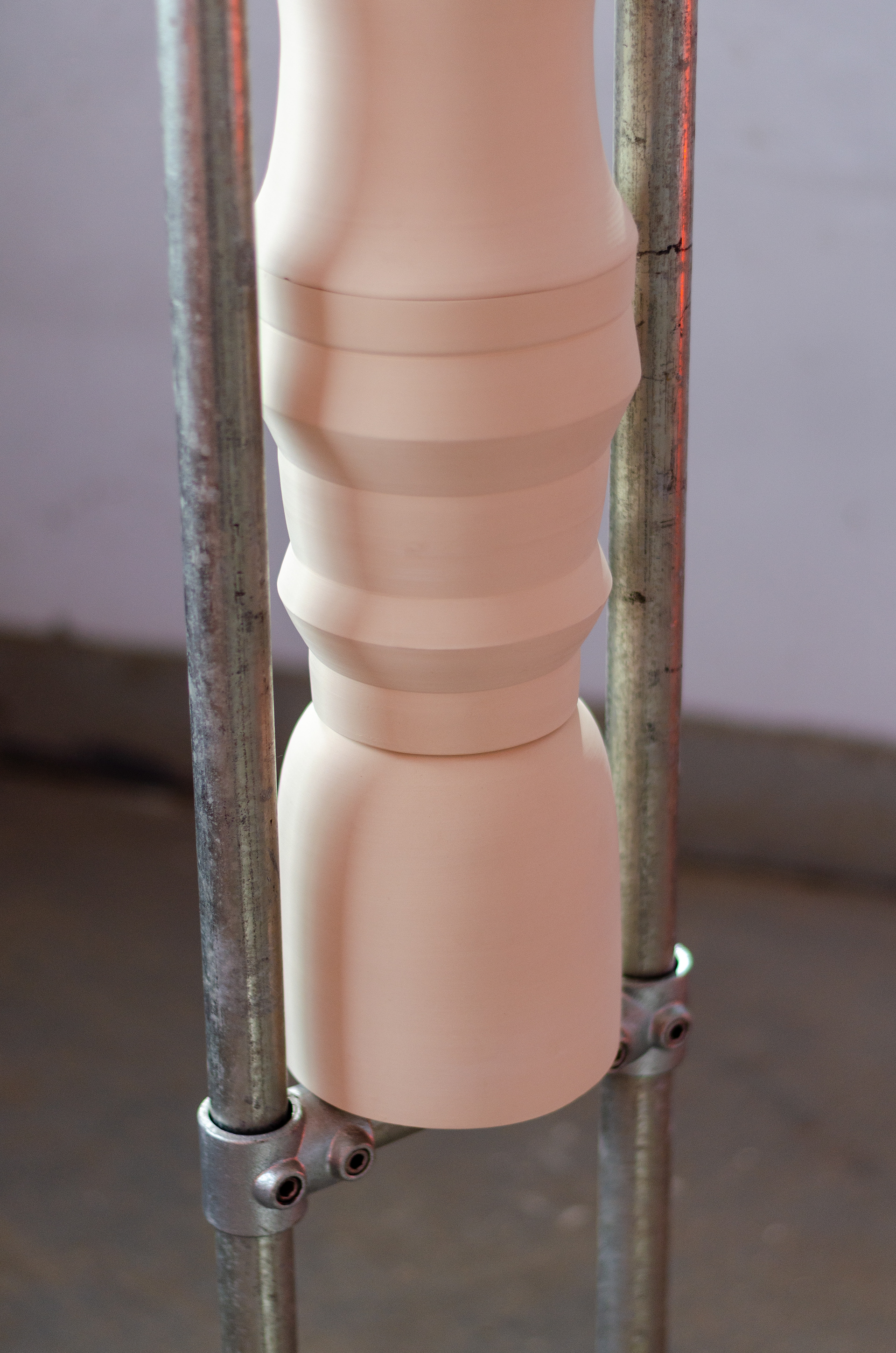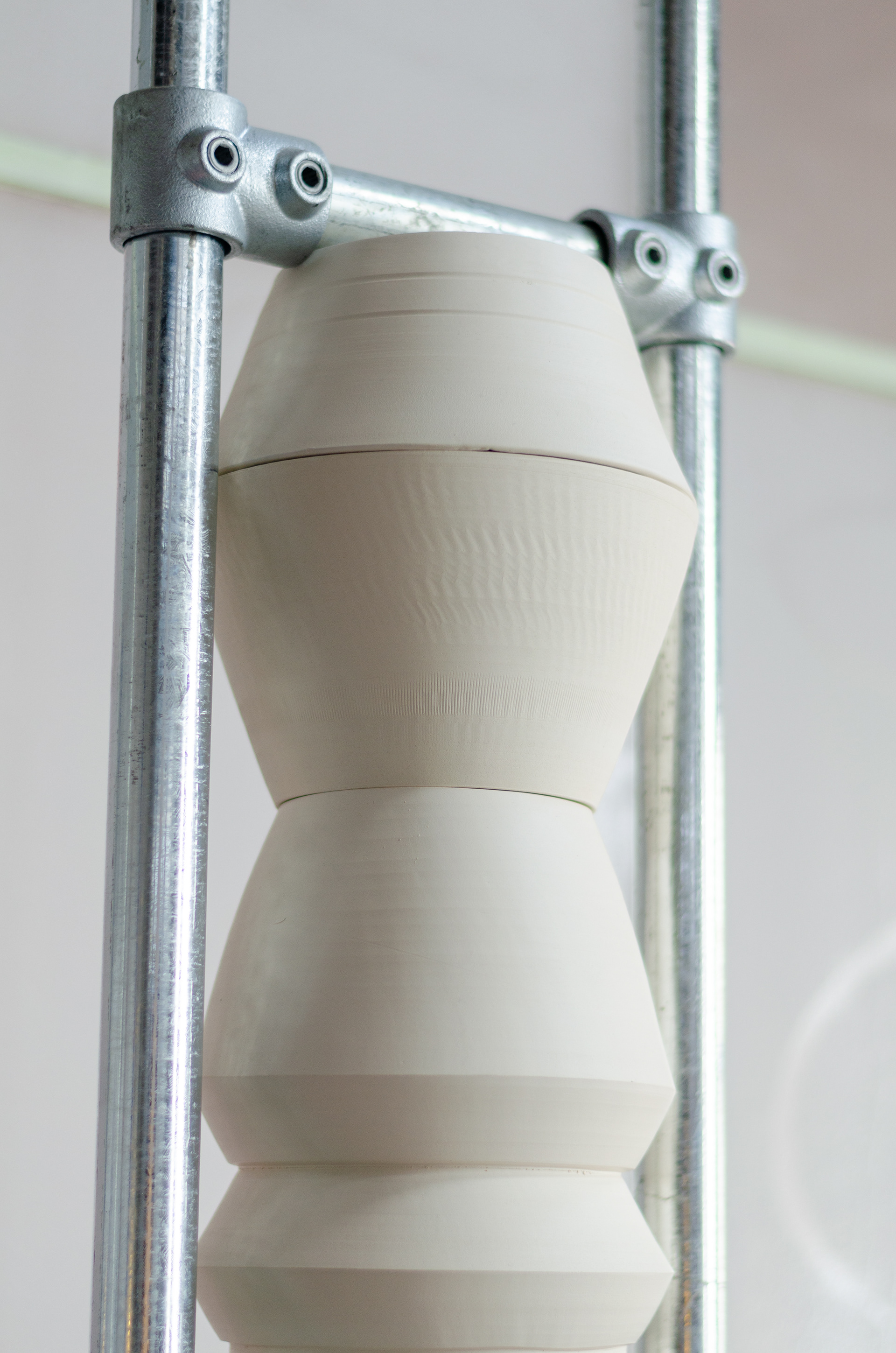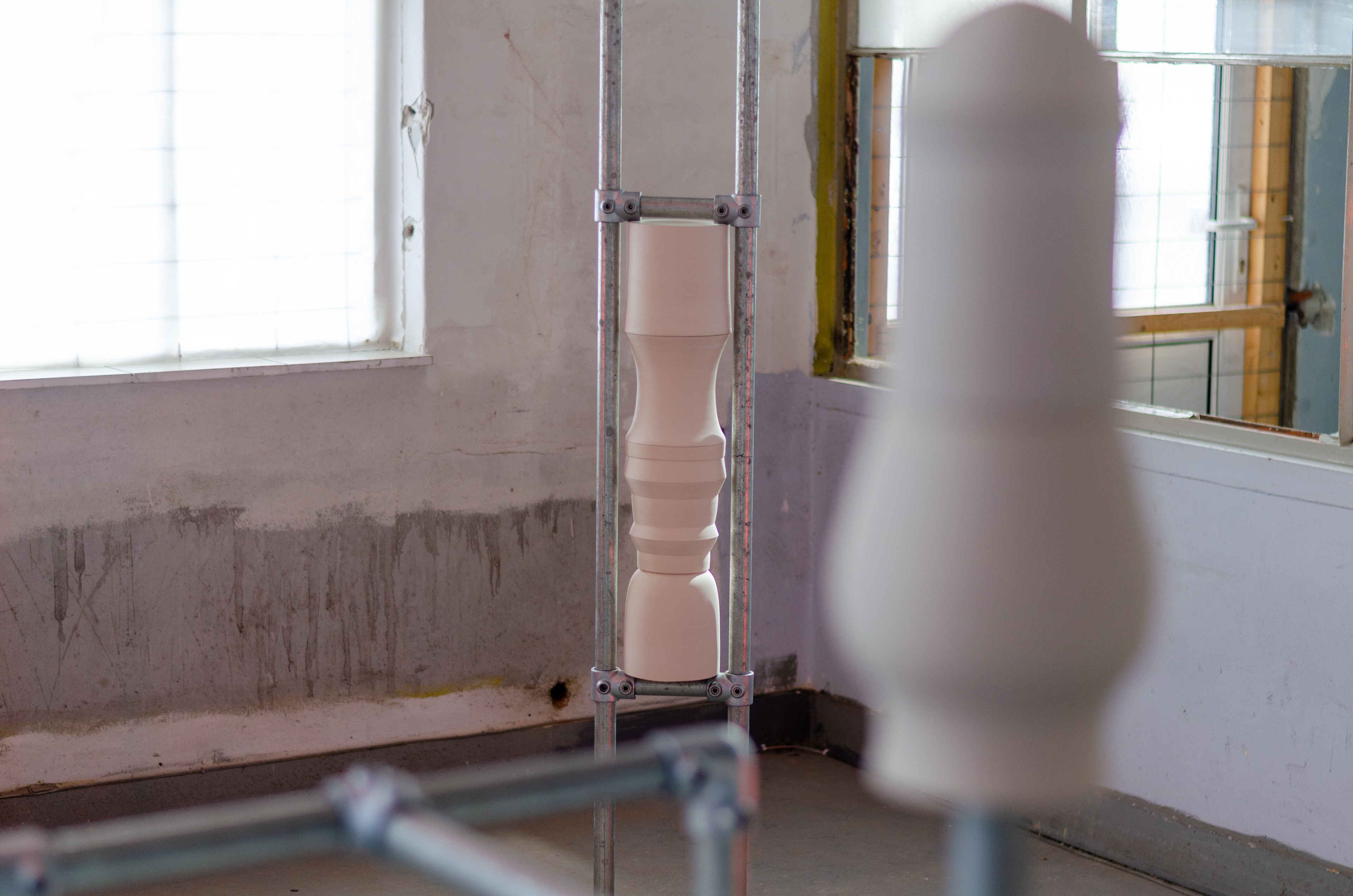 Ceramics and steel are two elements that regularly occur in Hannah Reede's work. Both materials are modular systems, both are materials to built with. One more precisely than the other. As soon as these materials are combined a tension arises in which the materials complement each other. The machine-made scaffolding tube is combined with the handmade ceramic. A feminine and masculine side. Who is carrying who and who is being carried?