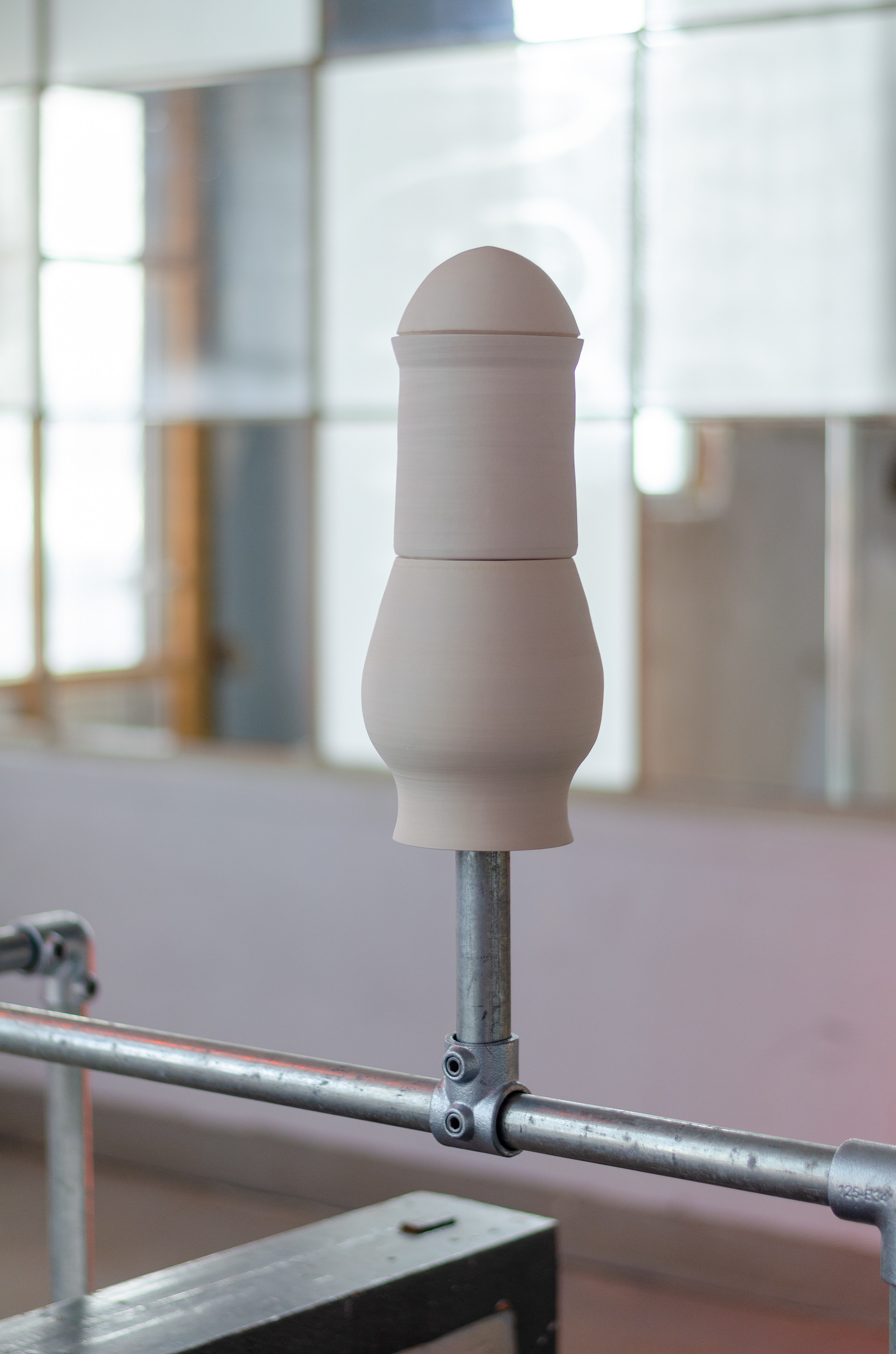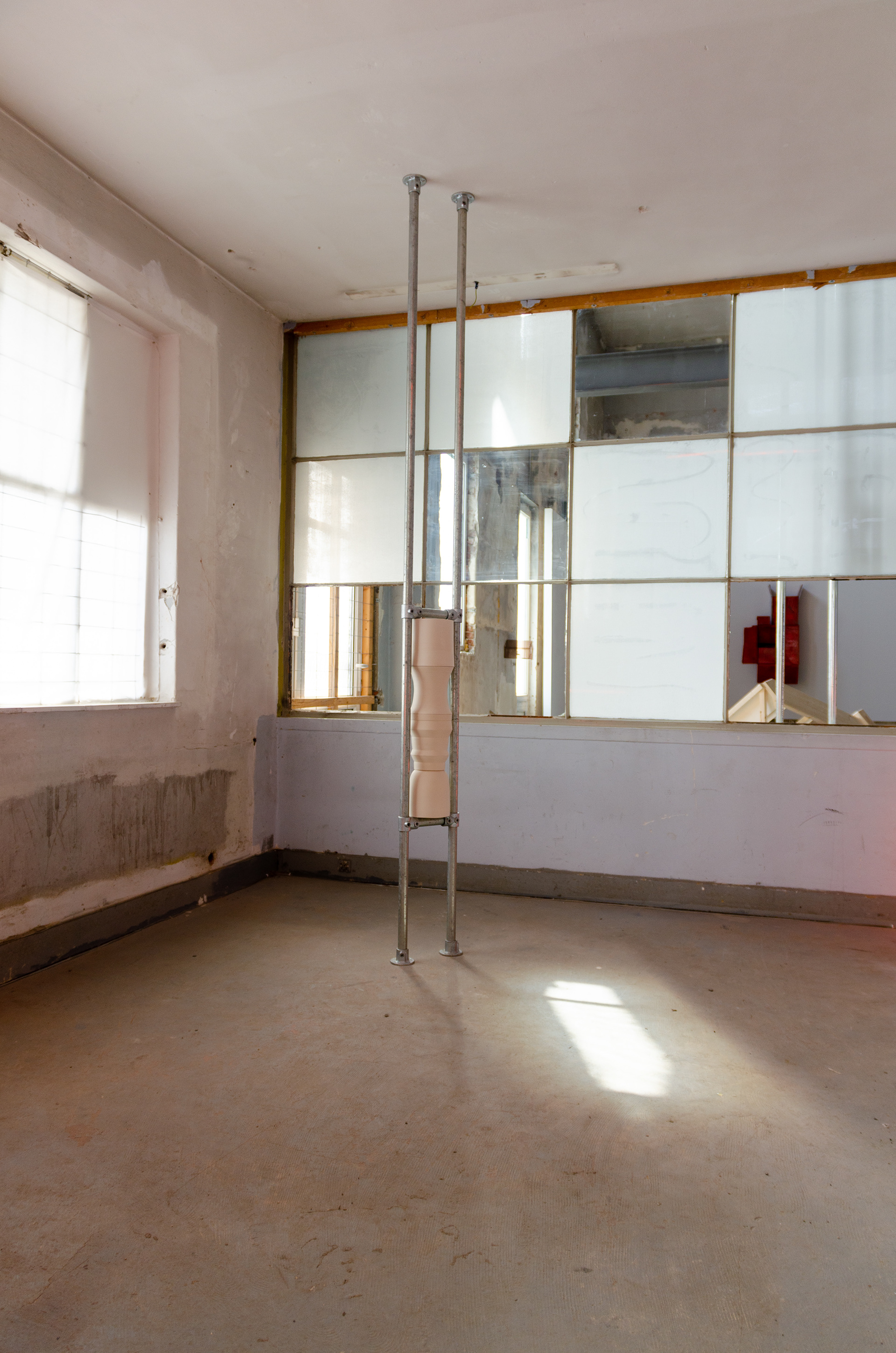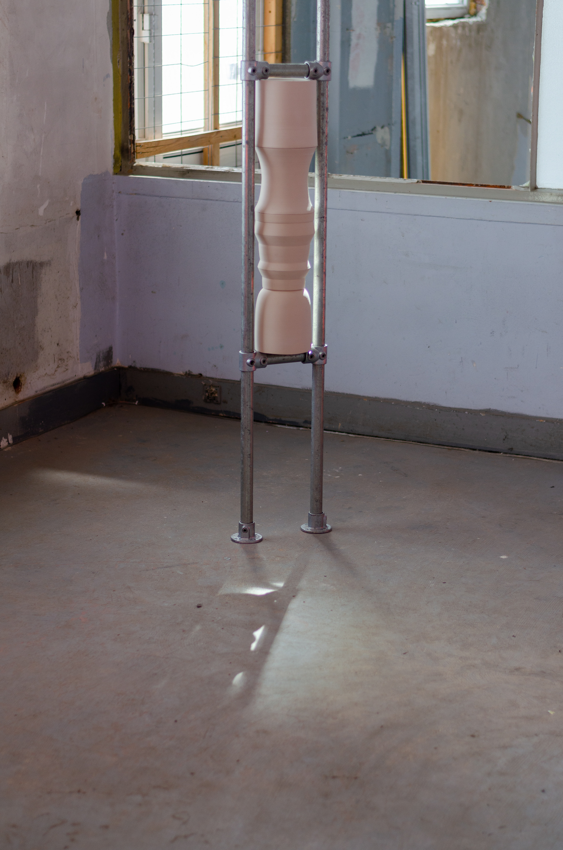 Ceramics and steel are two elements that regularly occur in Hannah Reede's work. Both materials are modular systems, both are materials to built with. One more precisely than the other. As soon as these materials are combined a tension arises in which the materials complement each other. The machine-made scaffolding tube is combined with the handmade ceramic. A feminine and masculine side. Who is carrying who and who is being carried?